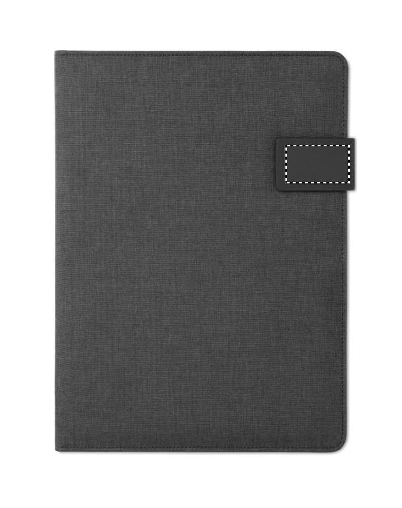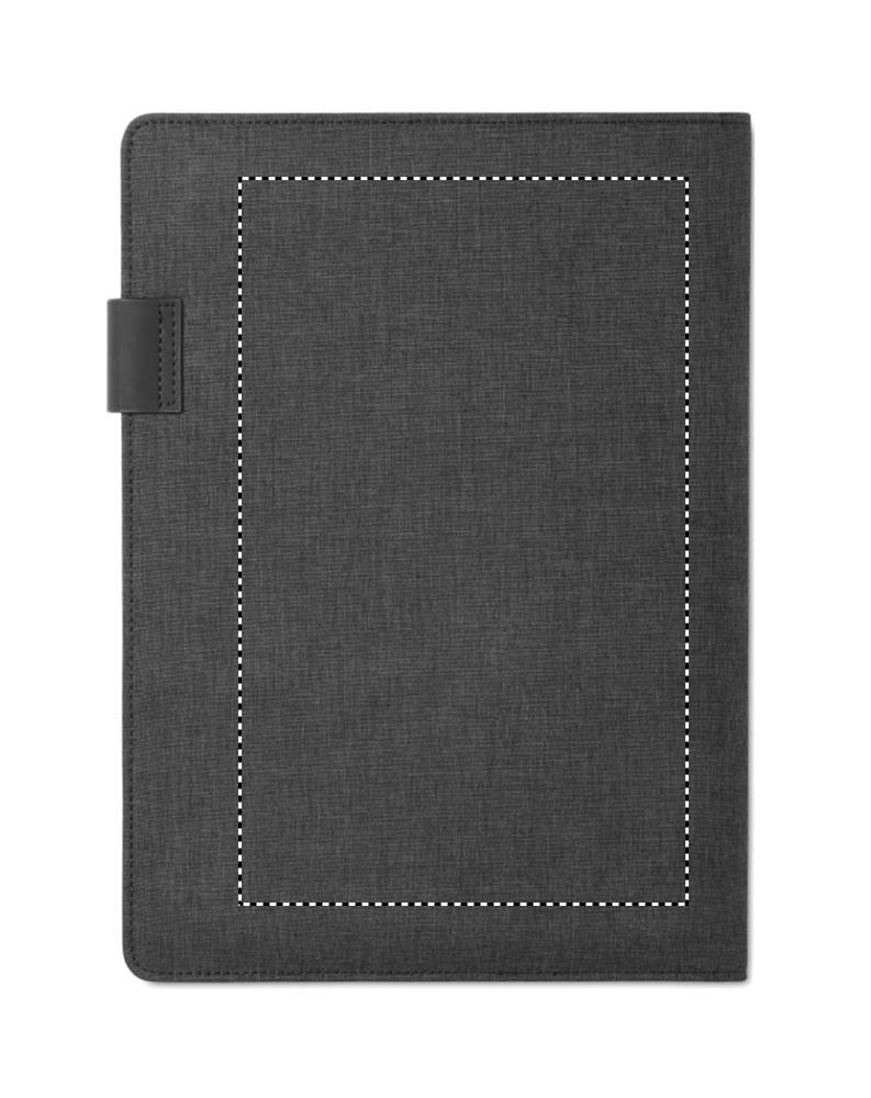 DIN A4 Portfolio mit Cover aus PU in Leinen-Optik. Magnetverschluss. Block mit 20 Blatt (40 Seiten) liniertem Papier. Inkl. 4000 mAh Powerbank und Mikro-USB-Kabel/Typ C. Smartphone- /Tablet Halterung. Kreditkarten Steckfächer. Stiftschlaufe.