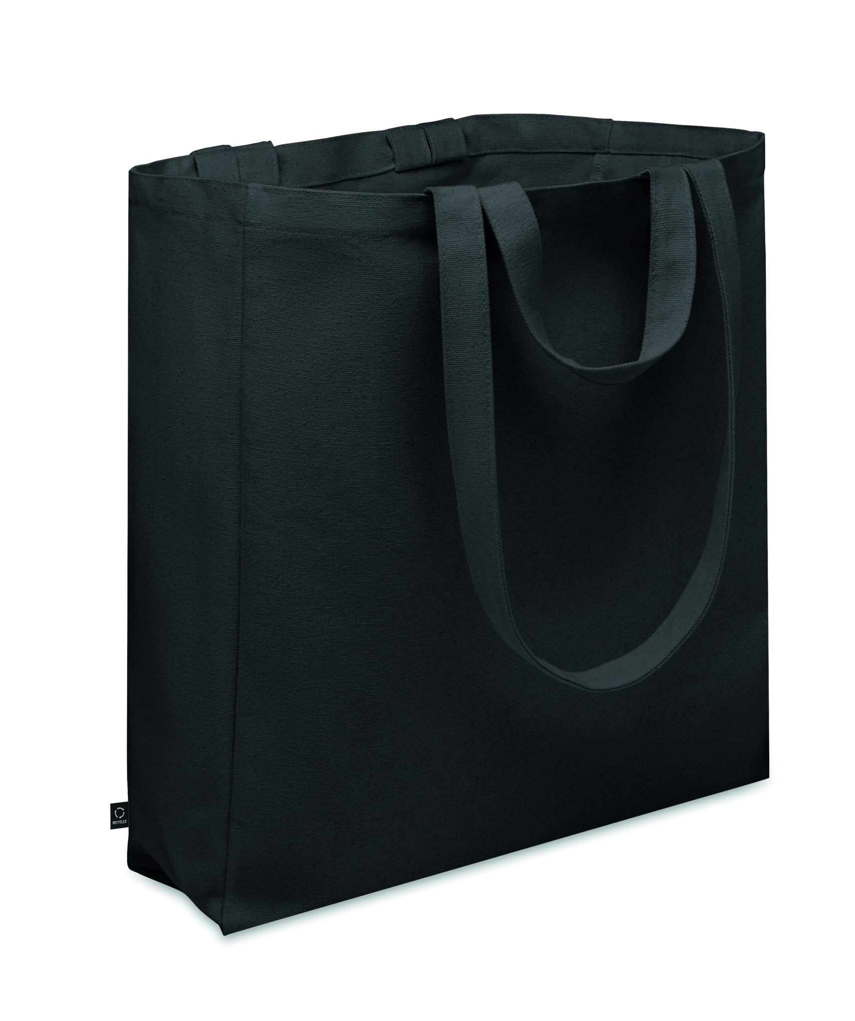 Einkaufs- oder Strandtasche aus recyceltem Polycotton (70 % recycelte Baumwolle, 30 % recycelter Polyester) mit kurzen Tragegriffen. Innentasche mit Reißverschluss. 380 g/m².