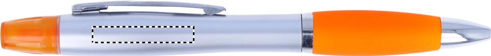 2 in 1 plastic ball pen and highlighter in silver satin finish and chromed fittings. Blue ink.