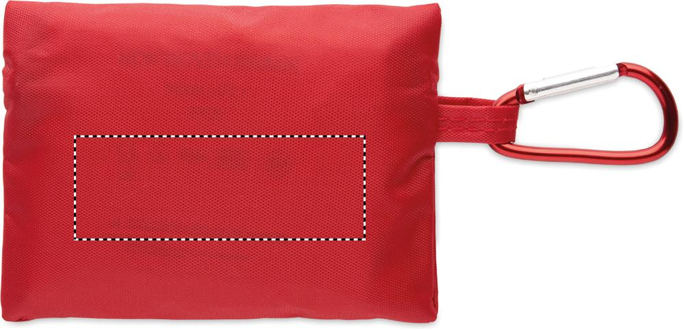 Compact first aid kit in RPET pouch with aluminium carabiner. Includes 4 alcohol swabs, 3 plasters, 2 bandages, 2 gauze pads, 1 tape, and 1 scissors. Not available for sale outside the EU.