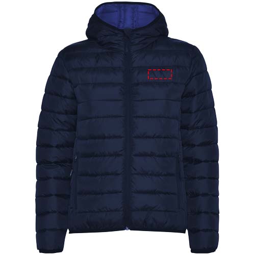 Women's feather touch quilted jacket with fitted hood. Inverted zips with matching chin protector. Two front pockets with zip. Matching elastic trim in cuffs, hem and hood. Contrasting inner lining. Stow carry bag included. Light and foldable garment. Fitted-cut. Water resistant. Wind-proof model.