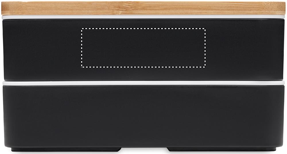 Recycled PP two-tier lunch box with removable divider and 3 cutlery utensils with attachable polyester band with bamboo lid. The lid has a phone stand functionality. Capacity: 400 ml (2x). Bamboo is a natural product, there may be slight variations in colour and size per item, which can affect the final decoration outcome.