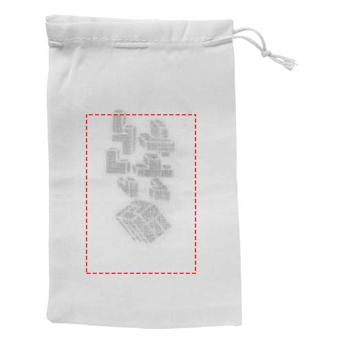 Wooden square brainteaser that comes in a cotton pouch. Decoration not available on puzzle.
