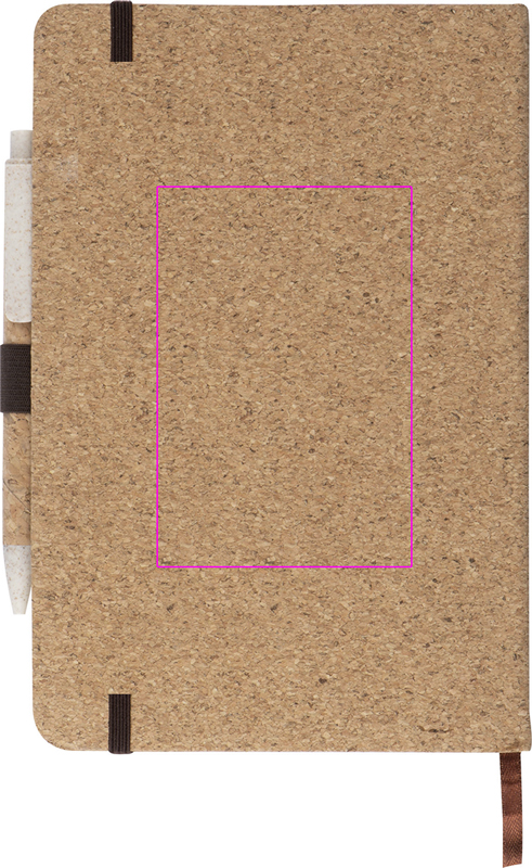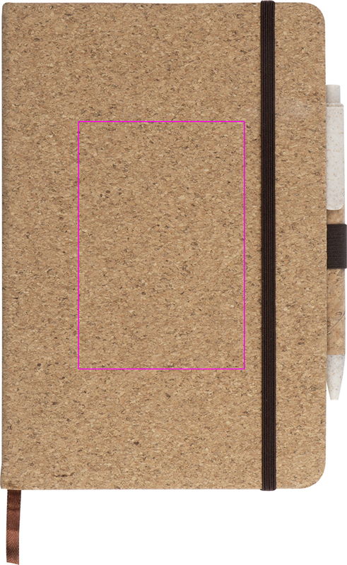 A5 korgist kaanega märkmik, 160 punktiirlehega, elastne rihm, pliiatsiaas ja korkkattega nisuõlest pastapliiats pappkarbis. Logo trükitakse raamatule.