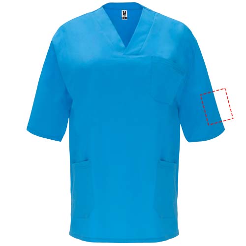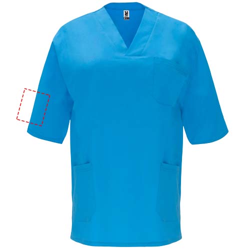 Lühikeste varrukatega unisex teeninduspluusi. Ristatud tipuga kaelus. Tasku rinnal ja kaks küljetaskut. Külgmised lõhikud allääres.