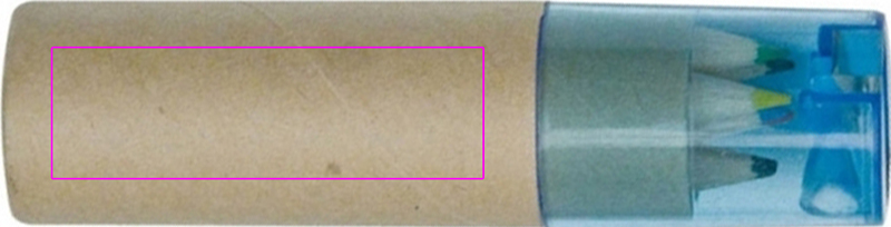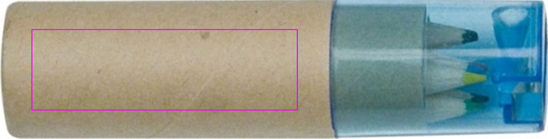 Pappkarp kuue lühikese paksu värvipliiatsi ja sinise läbipaistva plastikkaanega integreeritud teritajaga. Prindime kastile teie logo.