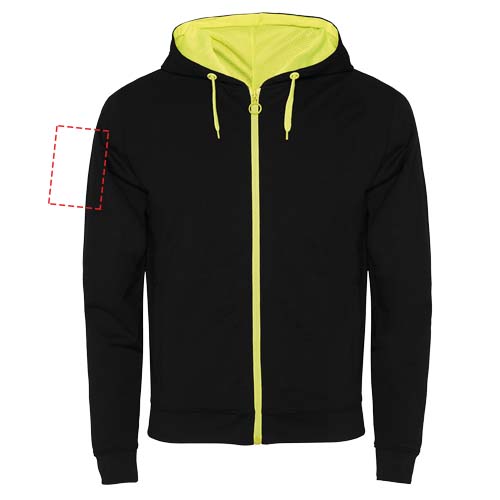 Verryttelytakki harjaamattomasta fleecestä kirkkaanvärisillä koristeluilla. Keskellä vetoketju kontrastivärisellä vetimellä. Hupussa kirkkaan kontrastivärinen vuori mikroperforoidusta polyesterikankaasta. Kiristysnyöri ja kirkkaan kontrastiväriset metalliset lenkit. 1x1-resori hihansuissa ja vyötäröllä. Kaksi etutaskua leveällä reunuksella. Kauluksen sisäpuolella vahvistetut koristesaumat. Irrotettava etiketti.