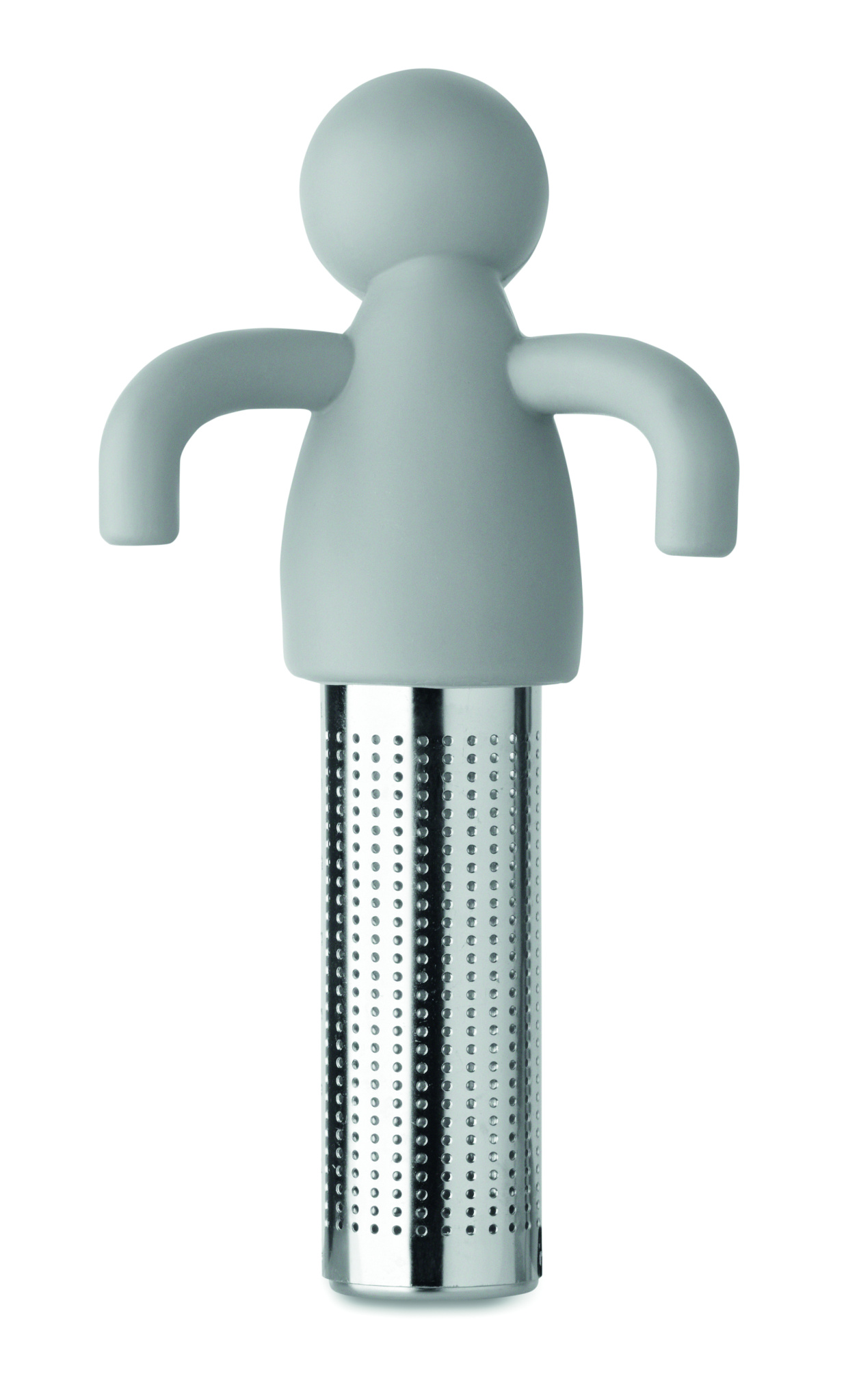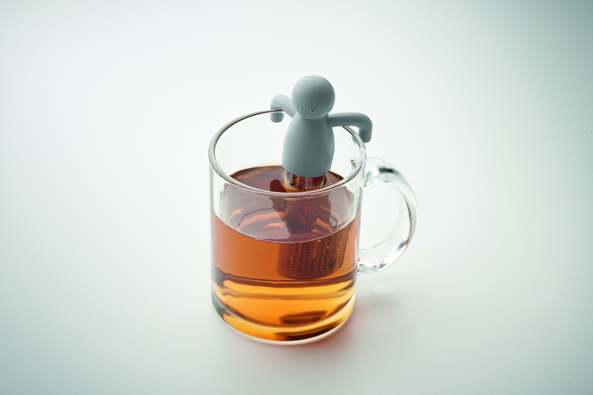 Hauska irtoteehaudutin. Pienen miehen muotoinen silikoni ja suodatin ruostumatonta terästä.