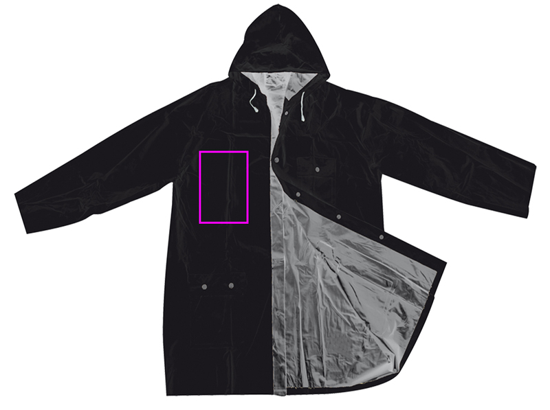 Käännettävä PVC-sadetakki hupulla, kahdella taskulla ja painonapeilla. Takin takaosa - 103 x 60 cm.
