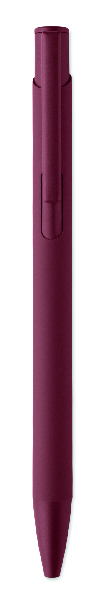 Kierrätetystä alumiinista valmistettu kynä, jossa on rautaklipsi ja värillinen kumipintainen runko. Sininen muste.