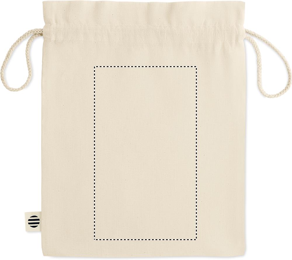 105 gr/m² keskikokoinen orgaanisesta puuvillas valmistettu pussi, kiristysnauhalla.