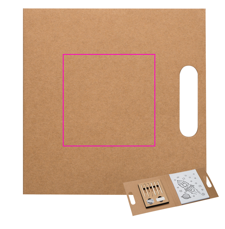 Värityskirjakansio kierrätetyllä kannella, maalipalikka (30 arkkia), kantoteline, teroitin, pyyhekumi ja värikynät 6 eri värissä. Logosi painetaan kanteen.
