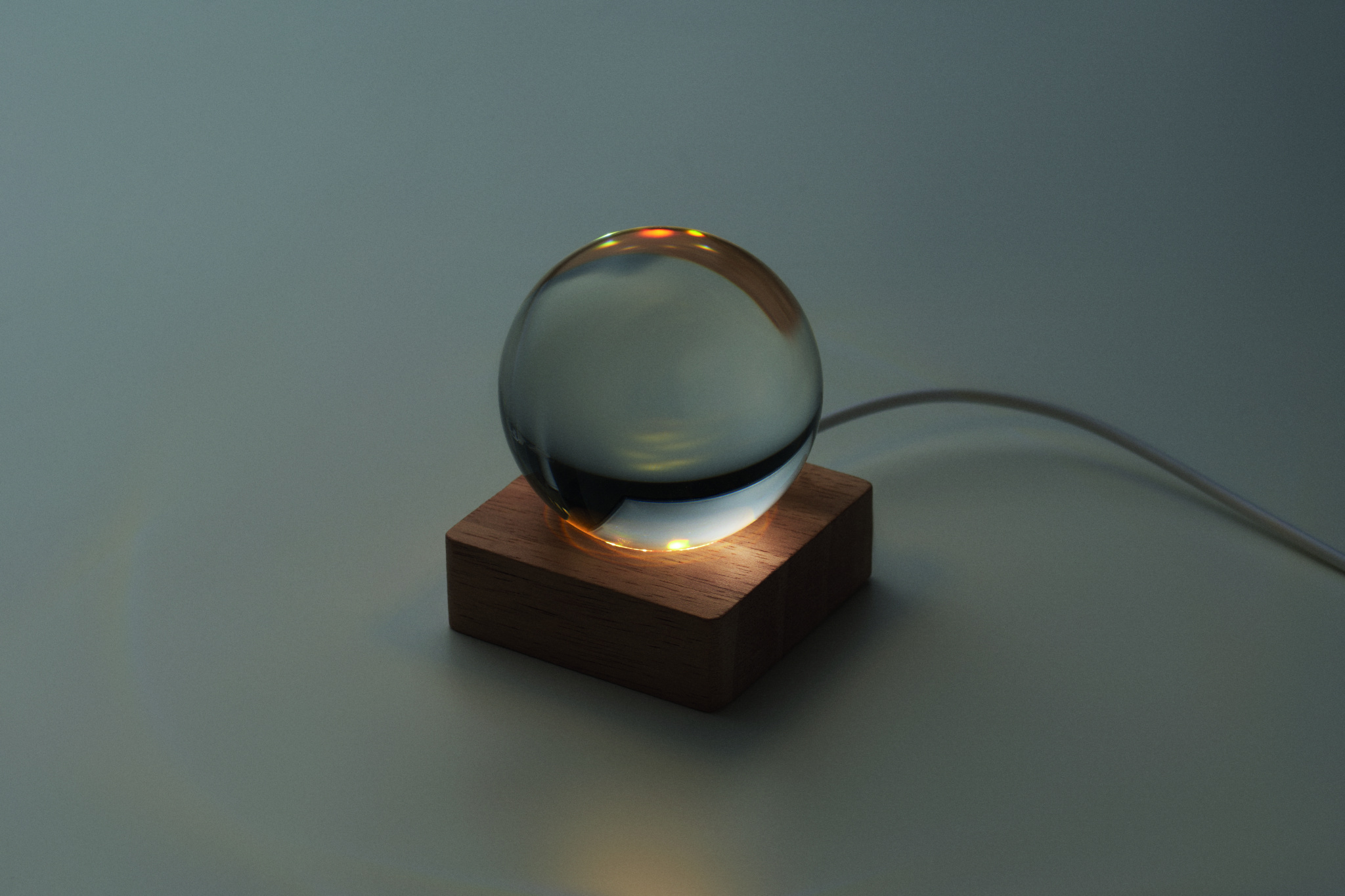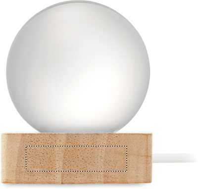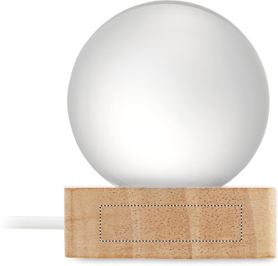 Lasipallo LED-valolla (100 lumenia) kumipuujalustalla. Mukana USB-latauskaapeli (90 cm).