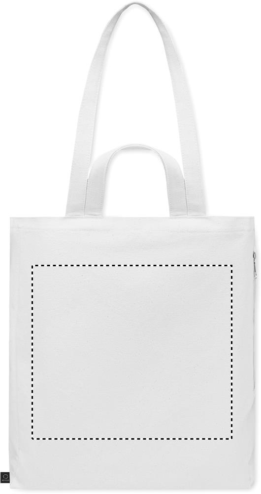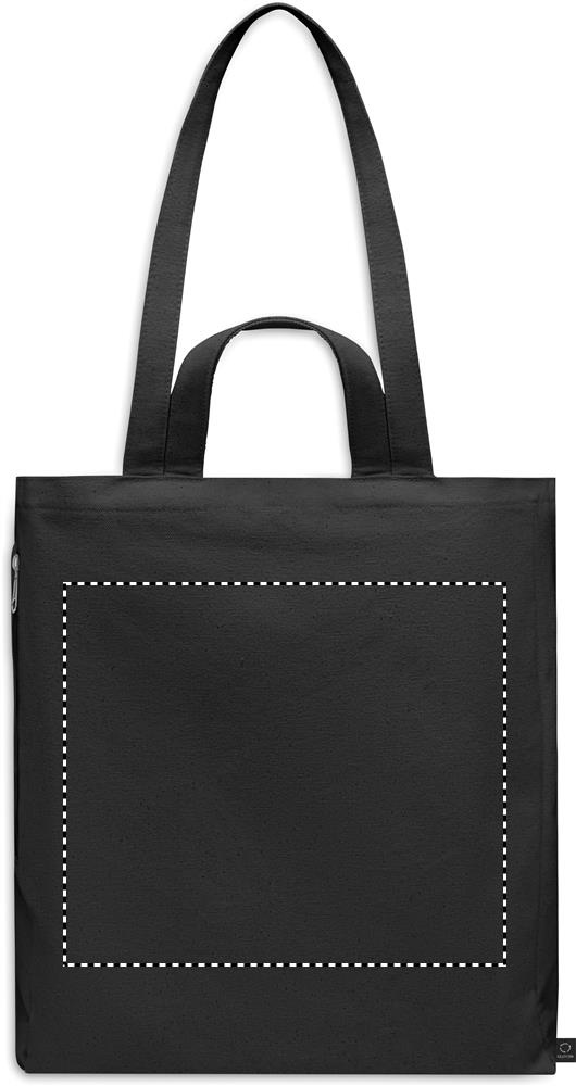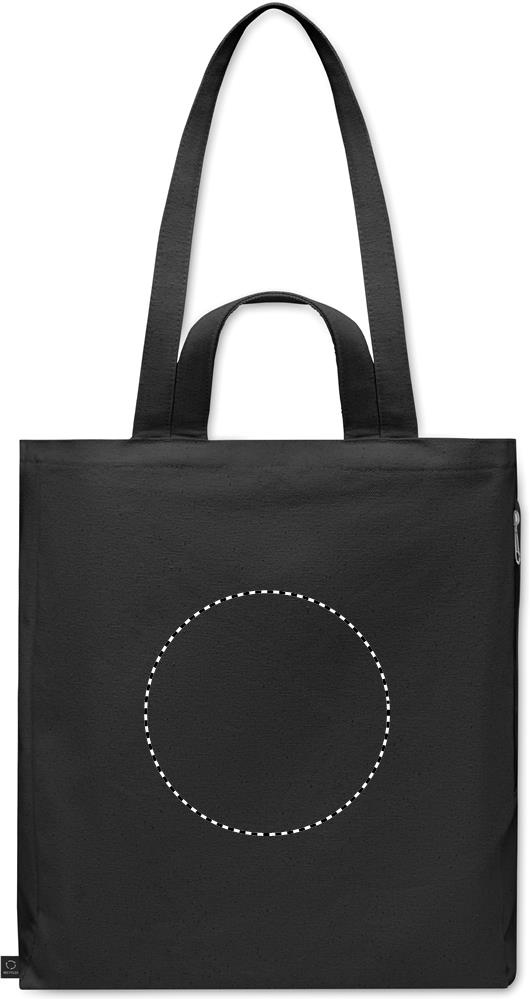Kierrätysmateriaalista valmistettu ostos- tai rantakassi lyhyillä kantokahvoilla. Kassissa on vetoketjullinen sivutasku. Materiaali 70 % kierrätettyä puuvillaa/ 30 % kierrätettyä polyesteriä, 380 gr/m².