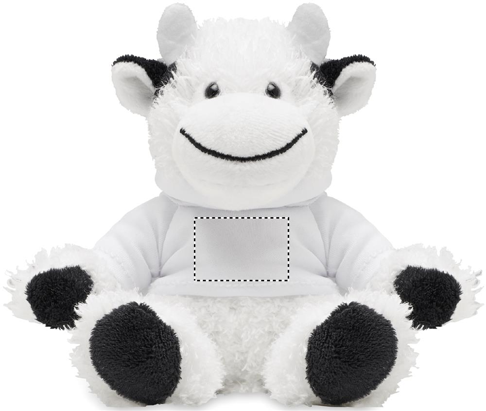 Lehmä pehmolelu, jolla on hupullinen paita. Ihanteellinen sublimaatiopainatusta varten.