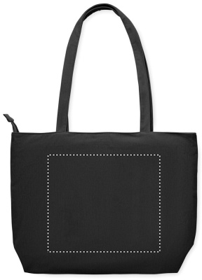 Suuri ostos-/rantakassi polyesterisamettikankaasta, vetoketjukiinnitys, avoin etutasku ja sisätasku. 220 g/m².