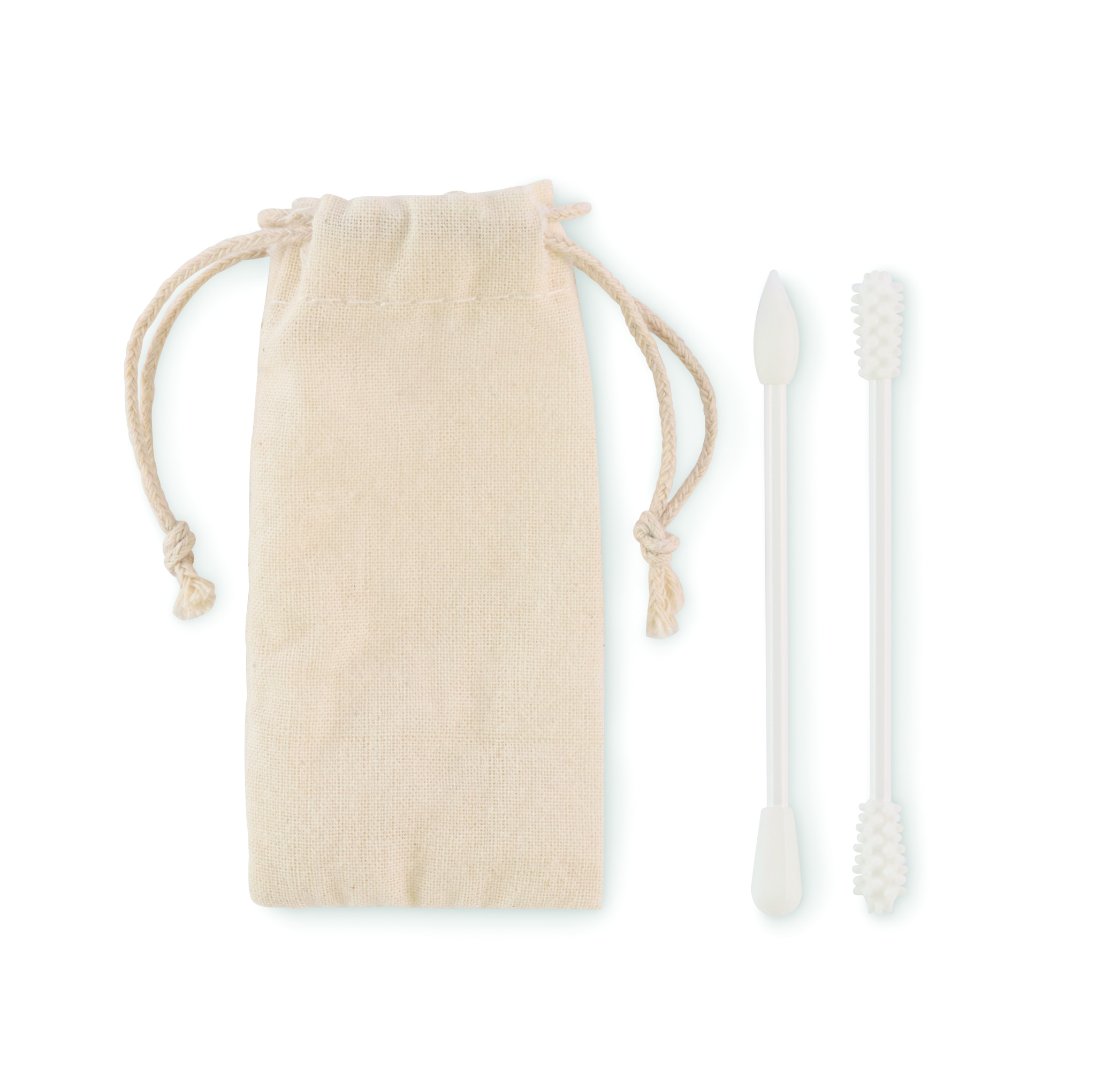 2 atkārtoti lietojamu un mazgājamu silikona tamponu komplekts ar 3 dažādām galviņām. Iegādāts auklas kokvilnas maisiņā.