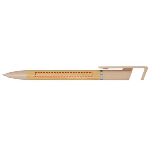 Бамбуковая шариковая ручка, которая также может служить подставкой для телефона. Кнопка и среднее кольцо изготовлены из переработанного пластика, наконечник — из латуни, а корпус — из бамбука, полученного из ответственных источников. Цвет чернил: синий. Длина непрерывной линии: 1000 метров. Размер пера: 1,0 мм.