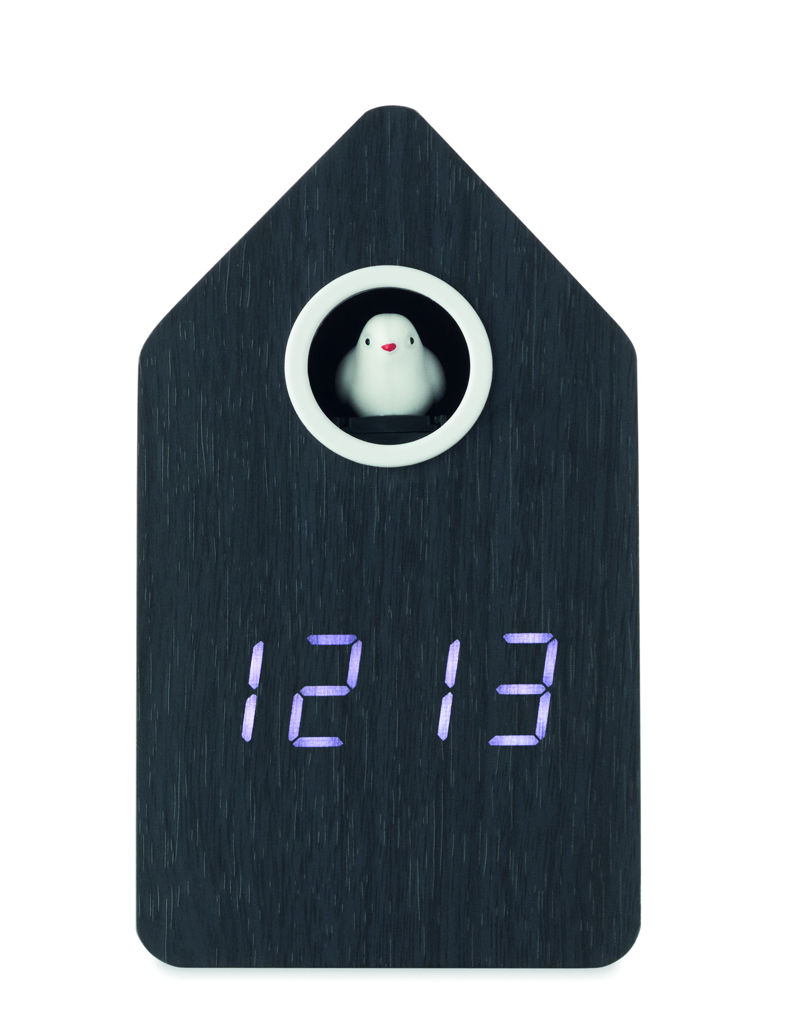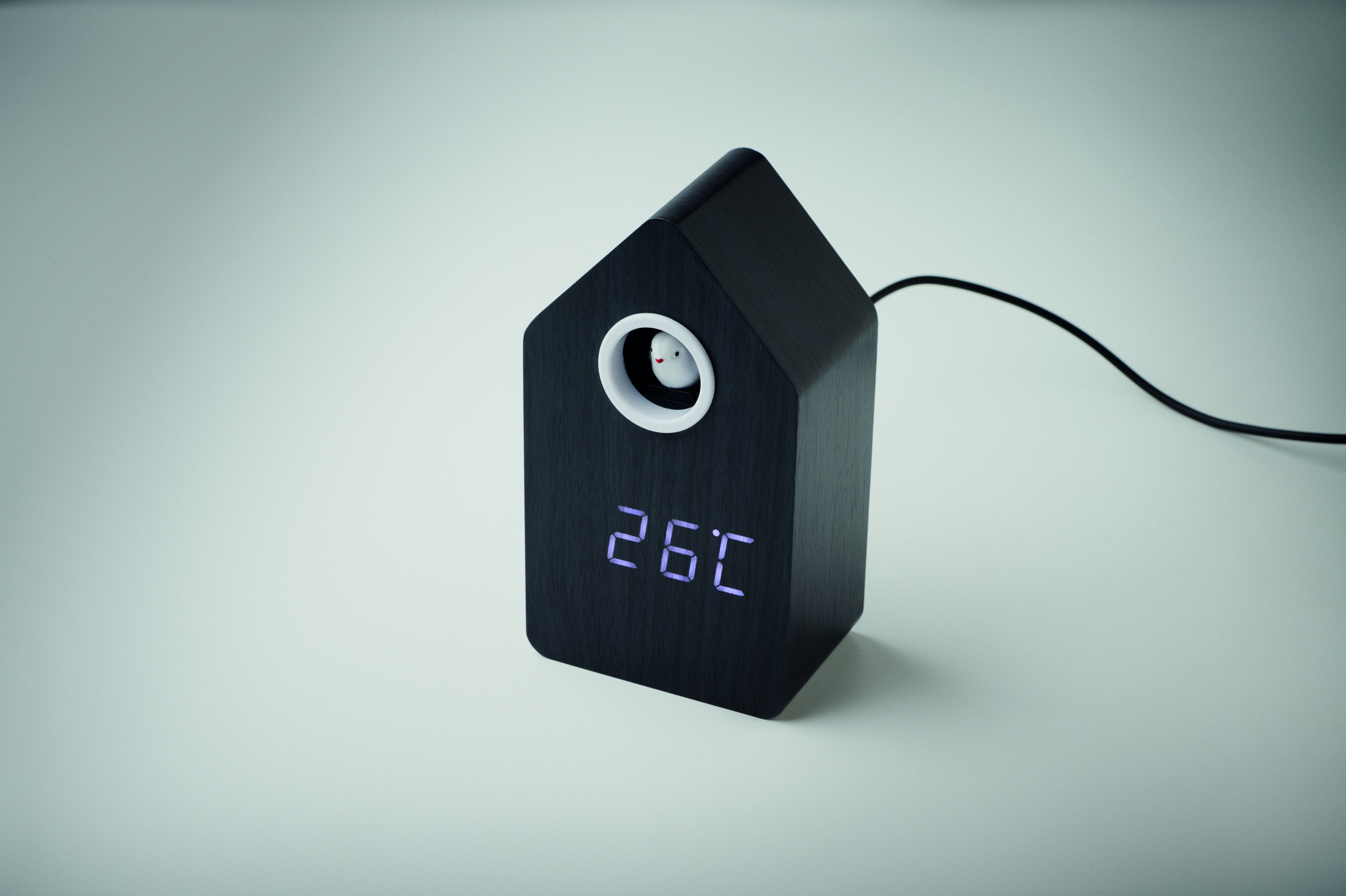 MDF cuckoo clock including a built-in alarm / temperature display. Bird will come out every full hour and during alarm and it has bird cuckoo voice. White LED display. Sound is automatically silenced between 22.00h to 06.00. 5 mins snooze intervals.