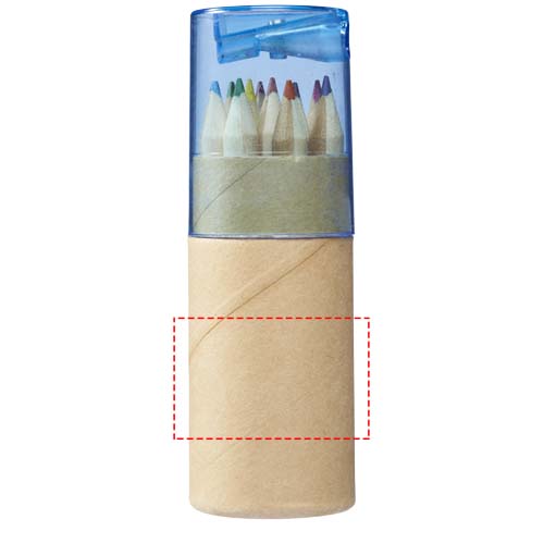 12 цветных карандашей в цилиндрической коробке с точилкой в пластиковой крышке. Нанесение не предлагается на элементы.