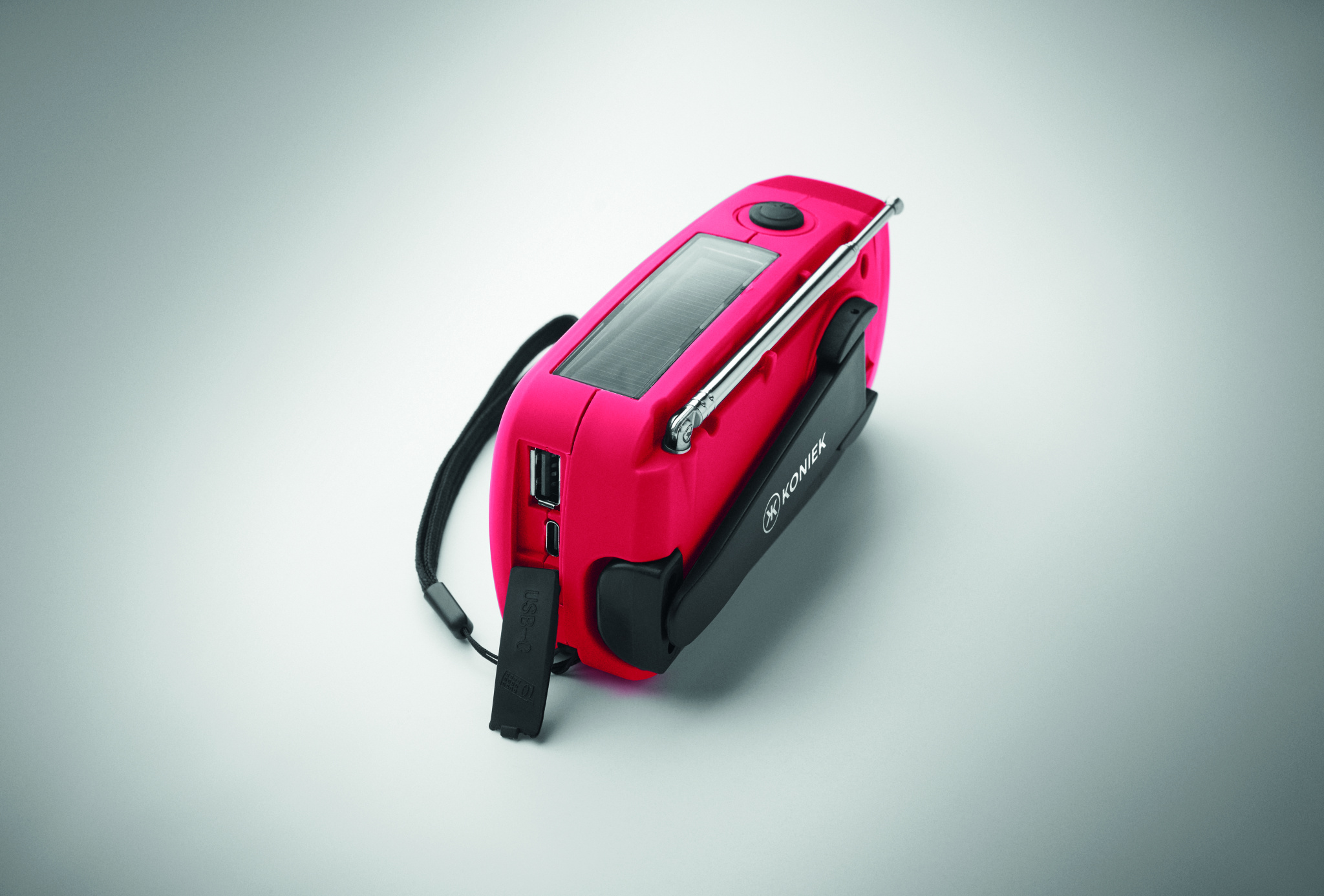 Portable AM/FM radio in ABS with LED Torch (2 settings) and a 1200mAh Power bank for emergency charging. Self powered by solar and hand crank.
