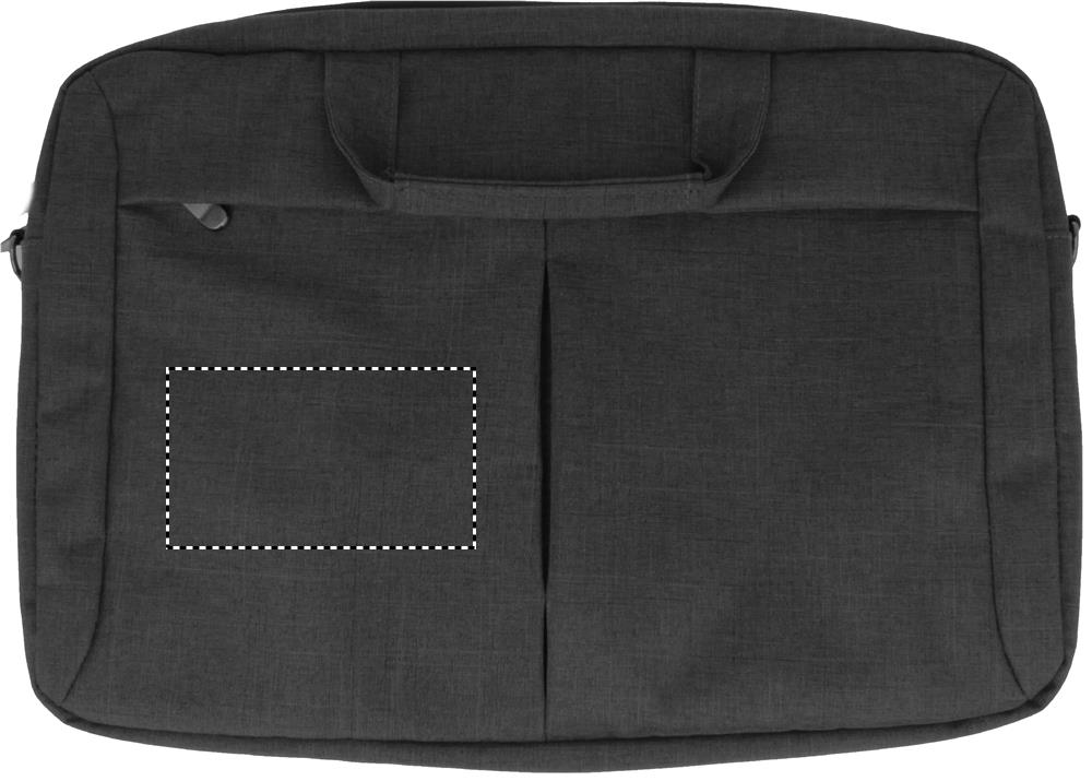Сумка для ноутбука из полиэстера со съемным ремнем для крепления на чемодане. Имеет наружный карман на молнии, а также отделения для письменных принадлежностей.