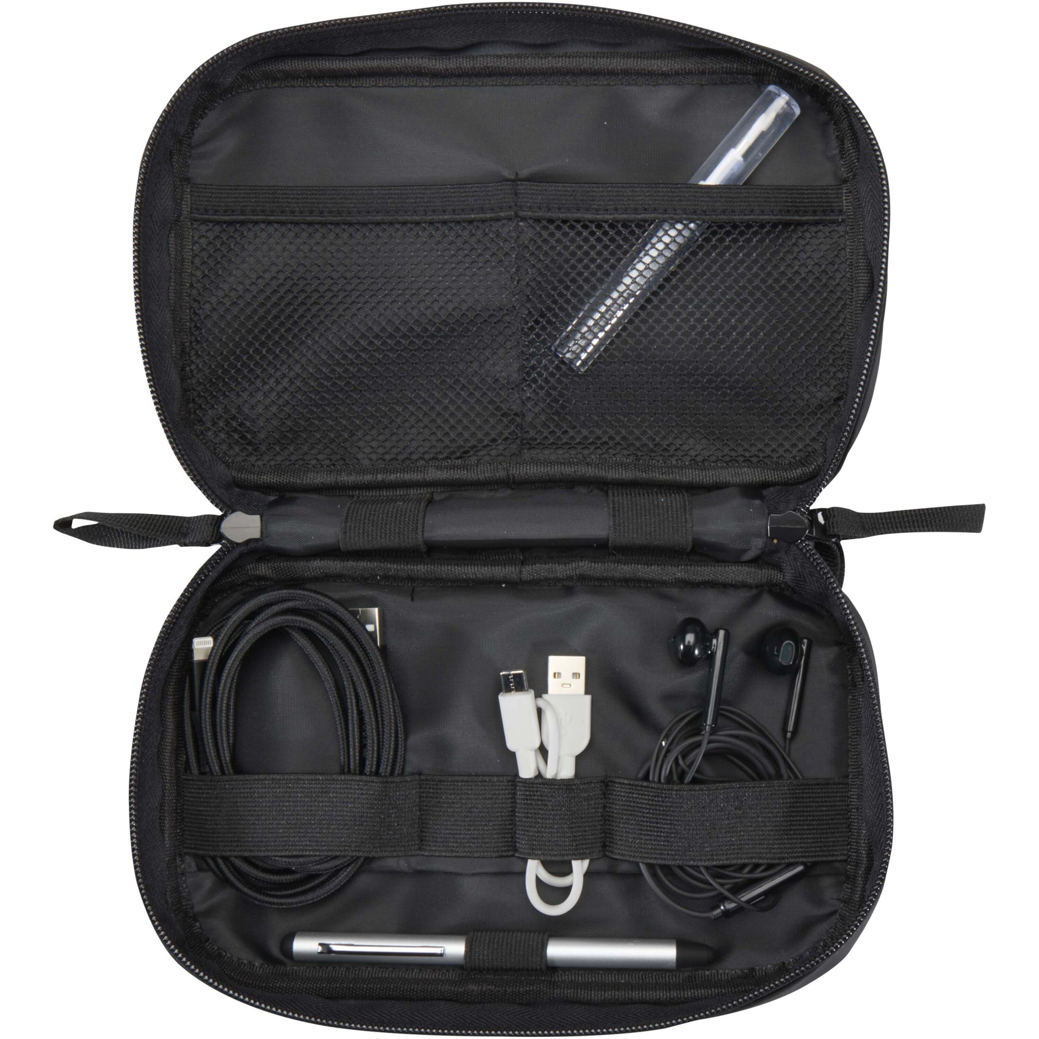 Эта сумка для техники, изготовленная из переработанной полиуретановой кожи, сертифицированной согласно GRS, с подкладкой из переработанного пластика PET, предназначена для путешественников, удаленных работников и любителей технологий. Компактная и удобная для переноски в рюкзаке или ручной клади, она имеет основное отделение на молнии с практичными функциями организации пространства, включая эластичную петлю для ручки, два сетчатых кармана для наушников и небольших аксессуаров, усиленный разделитель и несколько эластичных петель для надежного крепления кабелей, USB-накопителей и зарядных устройств. Снаружи имеется передний карман с застежкой-липучкой для быстрого доступа, а также ручка из тесьмы для удобства. Благодаря водостойкому покрытию ваши вещи будут в безопасности, куда бы вы ни отправились. Объем: 1 литр.
