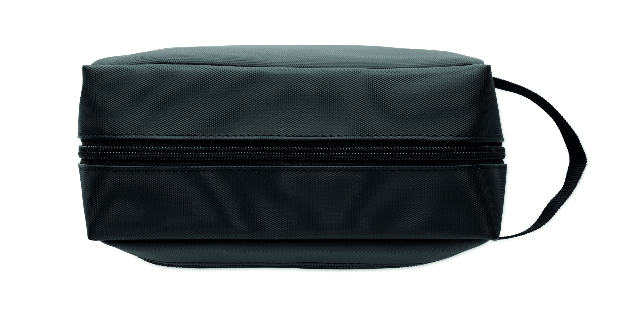 Toiletry bag made of 600D RPET polyester with PU coating and 210D RPET lining. Features zippered front pocket and handle.