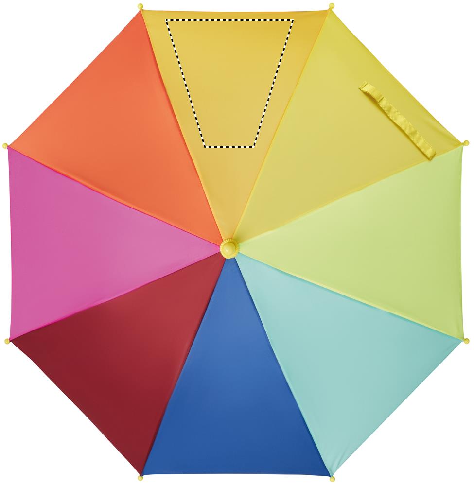 18'' barnparaply i 190T pongee med regnbågsmönster. Det har 8 paneler. Manuell öppning och uppfällning. Ribbor och ram i glasfiber. Handtag och spetsar i plast. Böjt handtag.