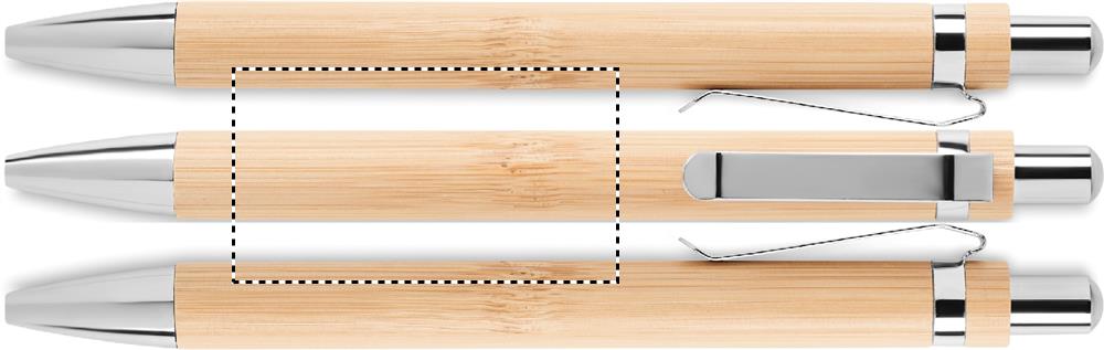 Långvarig bläckfri "evighetspenna" med tryckknapp med bambuhylsa och blanka krombeslag. Pennan skriver med grafitspetsen. Bambu är en naturprodukt, det kan förekomma små variationer i färg och storlek per föremål, vilket kan påverka det slutliga dekorationsresultatet.