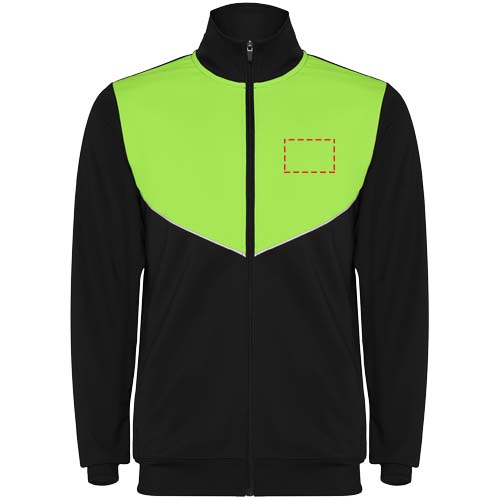 Träningsoverall i lätt och elastiskt tyg. Jacka med kontrasterande färg och sömnadskant på bröstet. Hög krage med kontrasterande sömmar. Centralt blixtlås fram. Sidofickor. 2 x 2 ribbade muddar och midja. Byxor med elastisk linning och dragsko. Kontrasterande sidostycke med sömnadskant. Dragkedja i fåll.