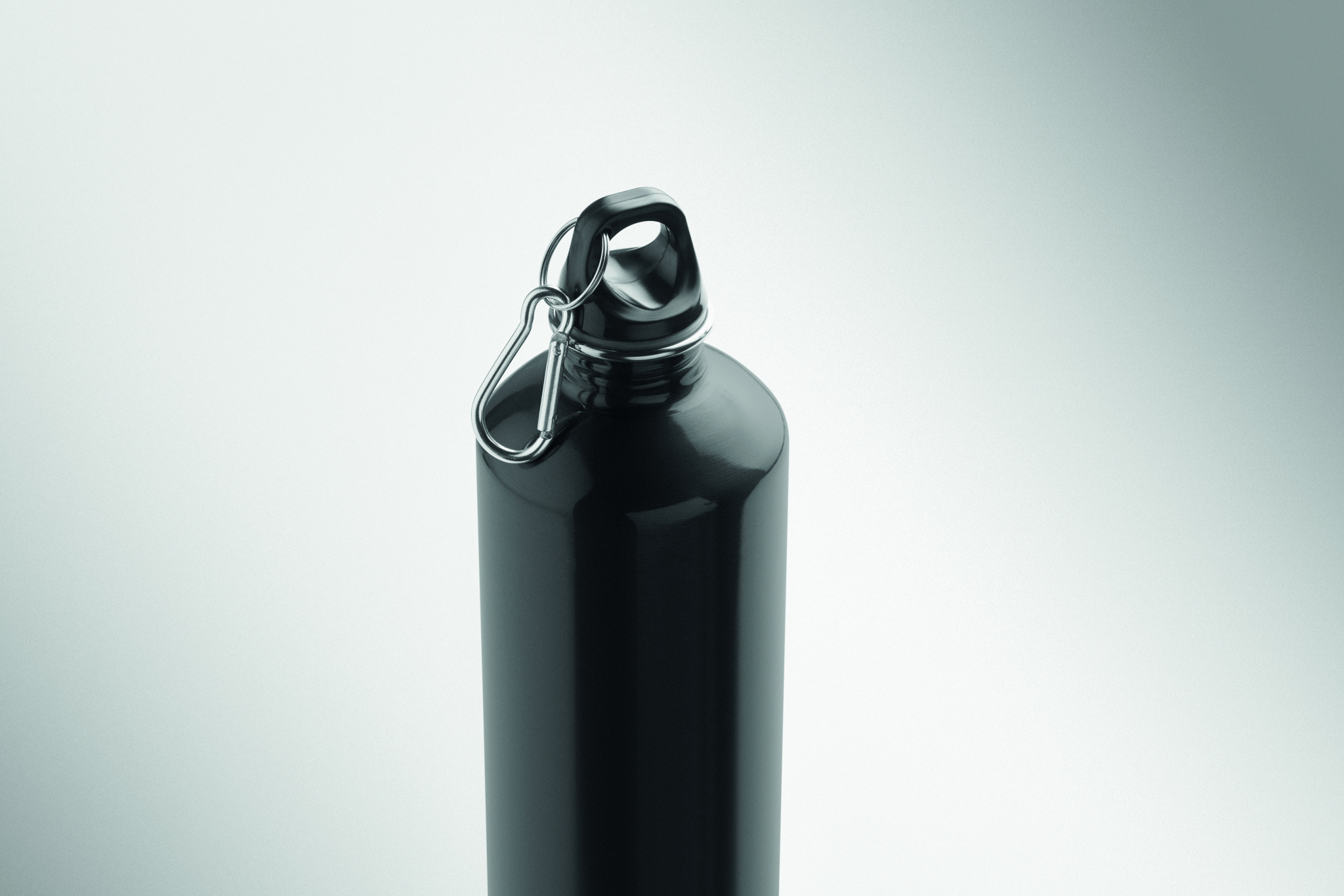Enkelväggig flaska (90% återvunnet rostfritt stål och 10% rostfritt stål) med PP-lock och karbinhake. Volym 1000 ml. Eftersom detta är en enkelväggig flaska kan värmeöverföring fortfarande förekomma.