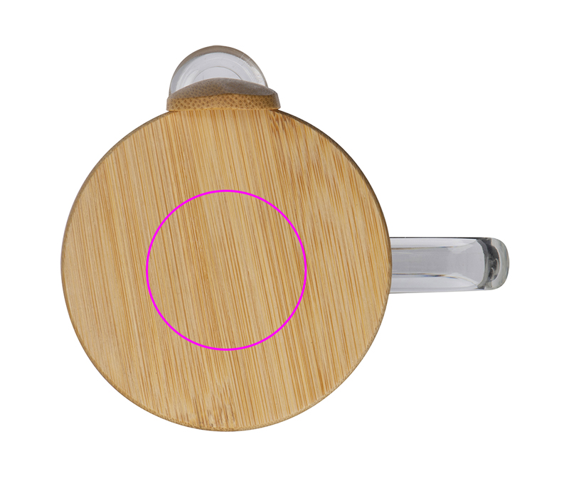 Borosilikatglasmugg med stängbart bambulock, integrerad bambusked och en kapacitet på 420 ml. Din logotyp kommer att graveras på locket.