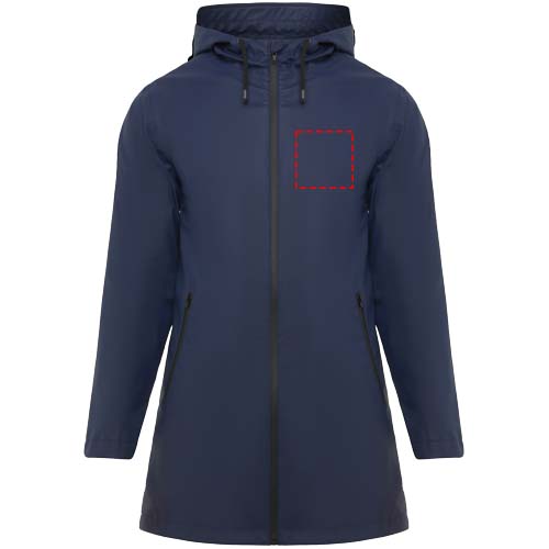 Vattentät regnjacka för dam. Huva med topp. Värmeförseglade dragkedjor och sömmar. Kontrasterande detaljer i svart. Två sidfickor med dragkedja. Slits i bakre fållen. Borttagbar etikett. Vattentät. Modellen är 179 cm och bär storlek S.